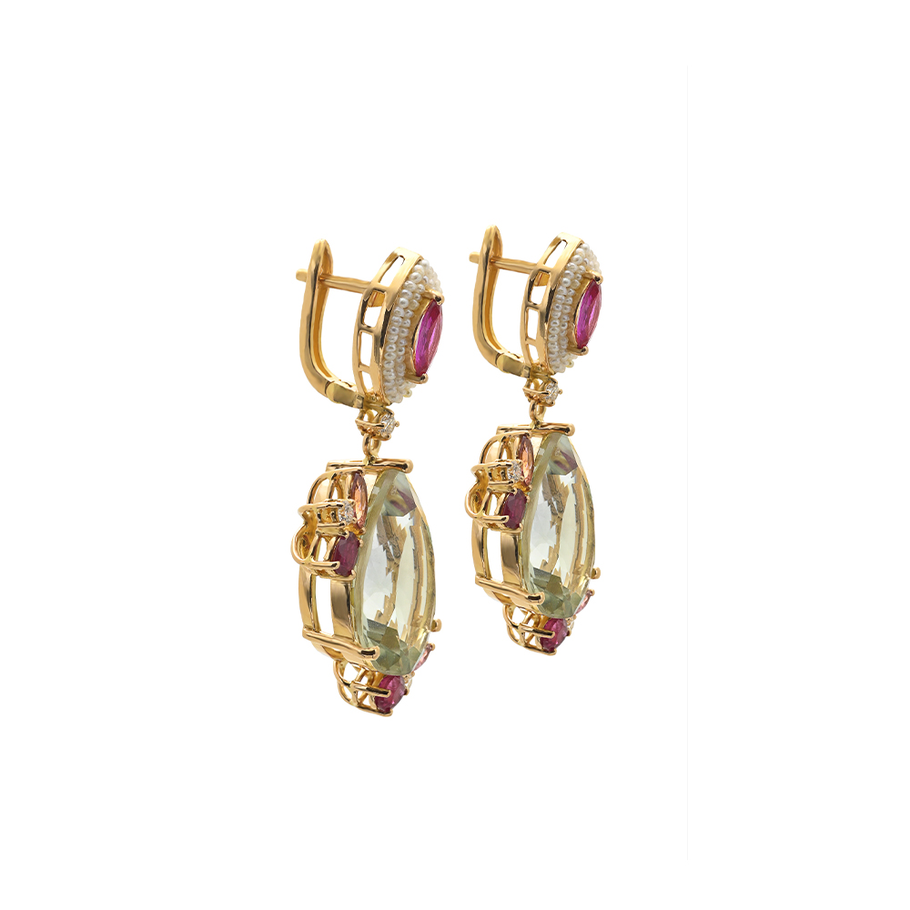 ذهب أصفر عيار 22 (12.2 جرام)، مرصع بالألماس درجة ڤي اس، اللون جي (0.22 قيراط)، الاحجار الكريمة (4.677 جرام)، ولؤلؤ بحريني طبيعي (0.18 جرام) تقريبًا.