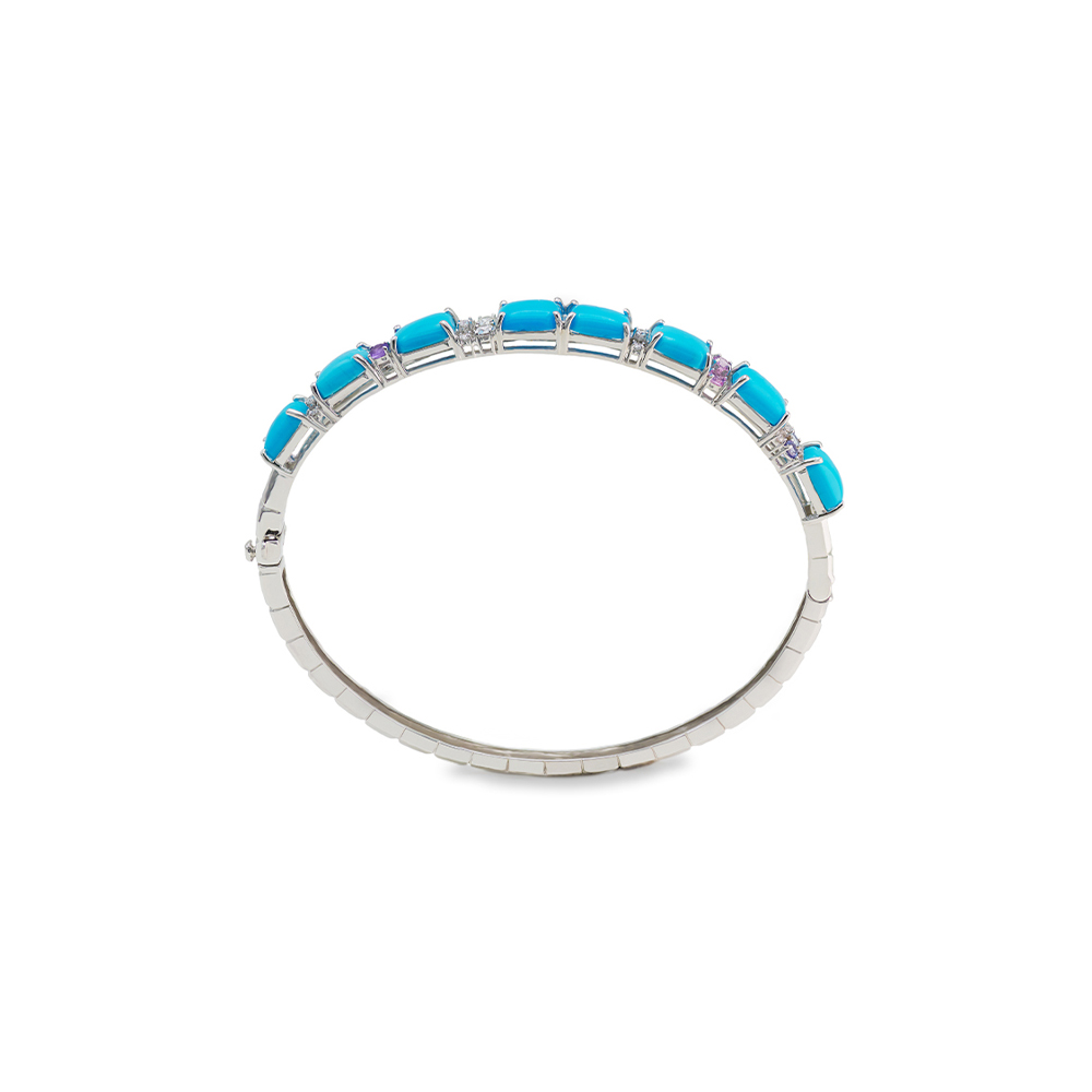 ذهب أبيض عيار 18 (12.31 جرام)، مرصع بالألماس درجة ڤي اس، اللون جي (0.42 قيراط)، وفيروز (1.272 جرام) تقريبًا.